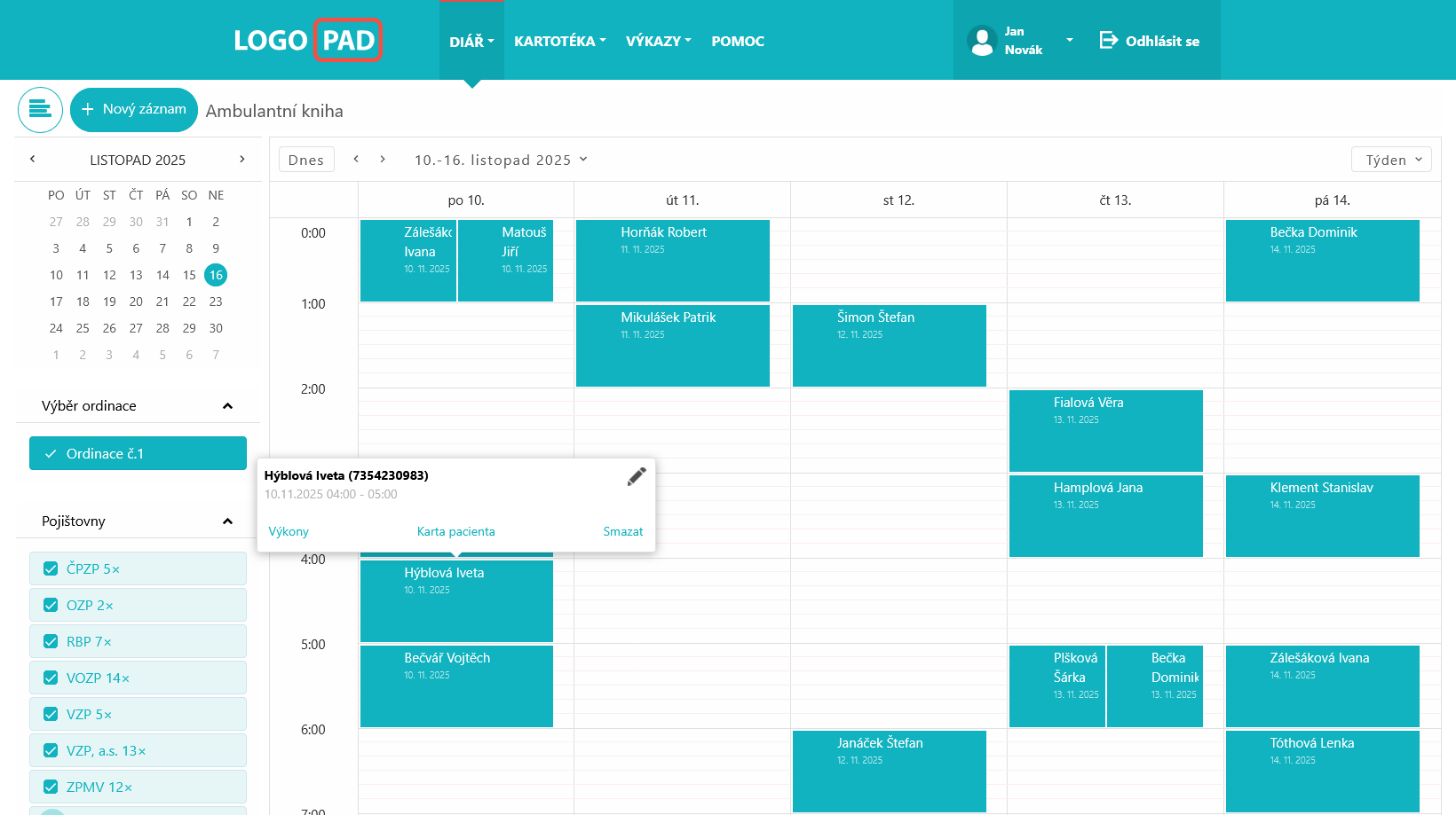 Kompletní přehled o pacientech a jejich návštěvách v přehledné elektronické ambulantní knize. Denní, týdenní i měsíční pohled.