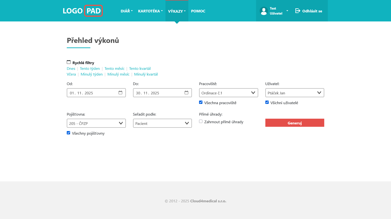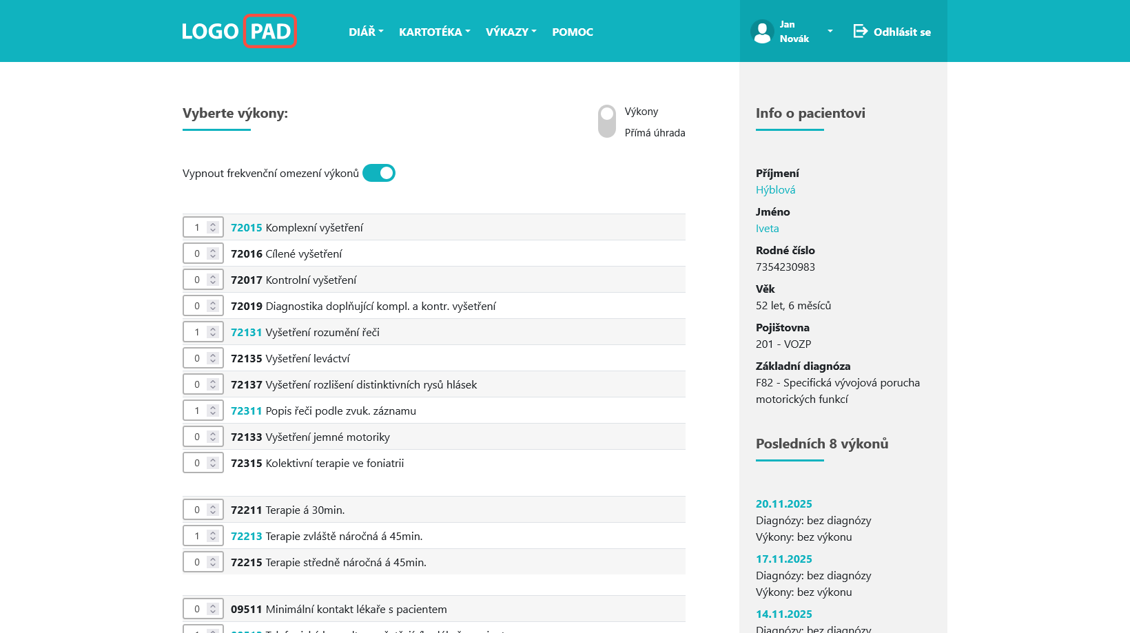 Historie výkonů, možnost kopírování předchozích výkonů, kontrola správnosti pojišťovny a typu pojištění, aj.